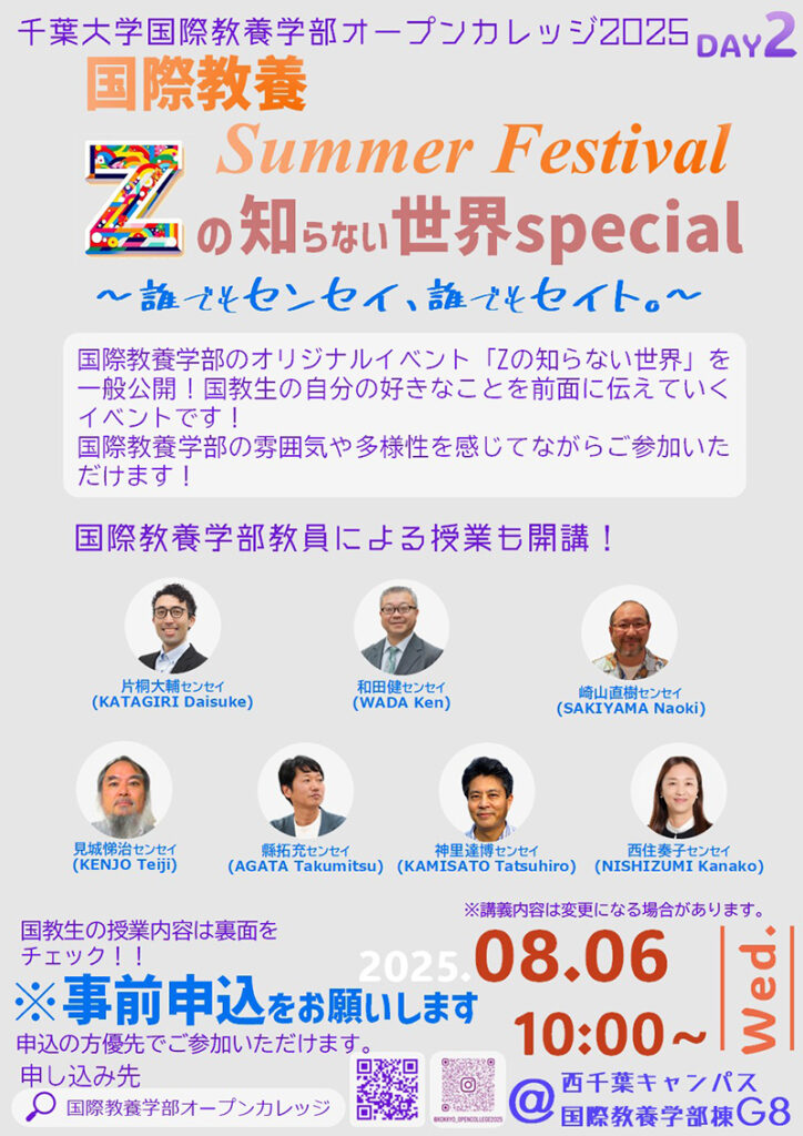 また今年度は、新たに「国際教養Summer Fes~Zの知らない世界special~」という企画を同時開催しました。まだ改善の余地はありますが、国際教養学部で経験できる学びや、在籍する学生や教員の「多様性」を体験してもらうための良いフォーマットとして、今後の可能性を感じることができました。