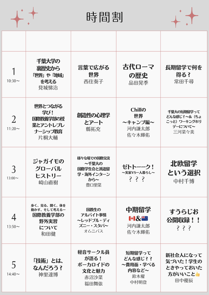 品田:企画・運営を通して、学生同士の交流を深めることを意識しました。そうすることで、「等身大の千葉大生」や「自由な雰囲気」を伝えられると思ったからです。これまでは2年生以上が履修できるプログラムとして開講されていましたが、今年度から1年生も参加できるようになりました。高校との違いを一番実感しているであろう1年生には、初日のプレゼンテーションで「大学生の生活」を紹介してもらいました。