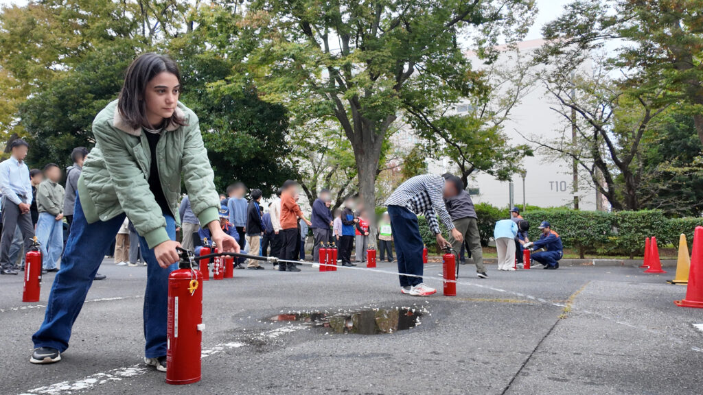 その後、体験訓練として、千葉市稲毛消防署の協力のもと、消火器を使った消火訓練を行いました。参加者が「火事だ!」と周囲に呼びかけた後、消火器の安全栓を引き抜き消火にあたるなど、初期消火の手順を実践しました。