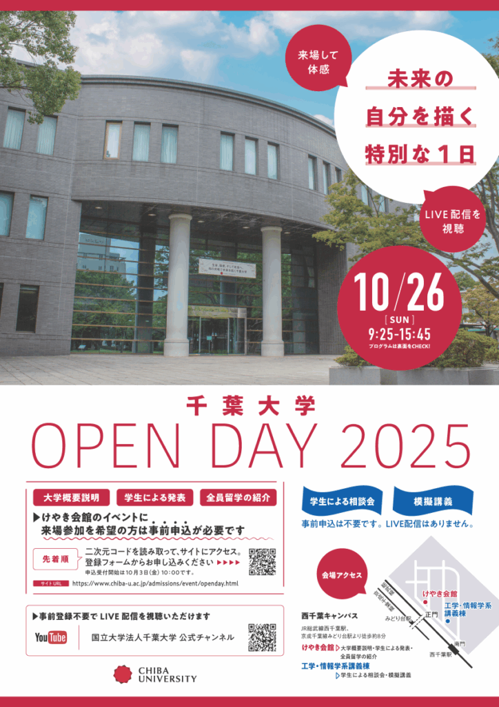 千葉大学では、10月26日(日)に来場型イベント『千葉大学オープンデイ2025』を開催します。当日は、千葉大学の公式YouTubeチャンネルにてLIVE配信もしますので、ご自宅で視聴いただけます。